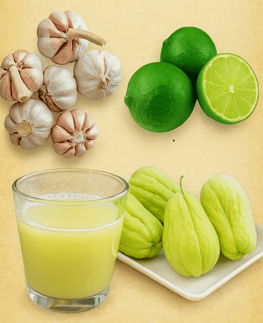 | Daily Drink | 1 chayote, 2 garlic cloves, 1 lemon in 2 cups water | Start with half portions; avoid if allergic |